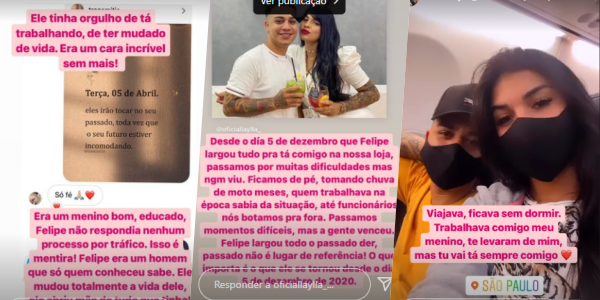 “Ele tinha orgulho de tá trabalhando, de ter mudado de vida, era um cara incrível, sem mais. Era um menino bom, educado. Felipe não respondia a nenhum processo por tráfico. Isso é mentira. Felipe era um homem que só quem conheceu sabe. Ele mudou totalmente a vida dele. Abriu mão de tudo o que tinha”, escreveu em um dos stories compartilhados com seus quase 60 mil seguidores.